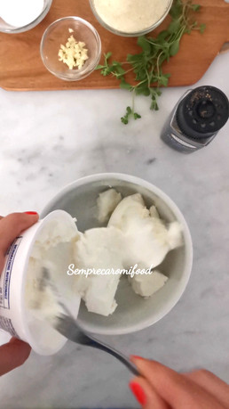 Nel frattempo in una ciotola mettete la ricotta, il parmigiano, l'aglio tritato, il sale, il pepe e le foglioline di maggiorana fresca. Mescolate il tutto per amalgamare bene.