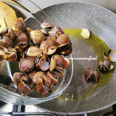 In una padella capiente scaldate l'olio evo, poi unitevi lo spicchio d'aglio e lasciatelo imbiondire. Aggiungete le vongole, sfumate con il vino bianco e poi chiudete il coperchio. Fate cuocere a fiamma alta per un paio di minuti fino a quando le vongole non si saranno aperte tutte. Dopodiché trasferitele in una ciotola e filtratene l'acqua di cottura.